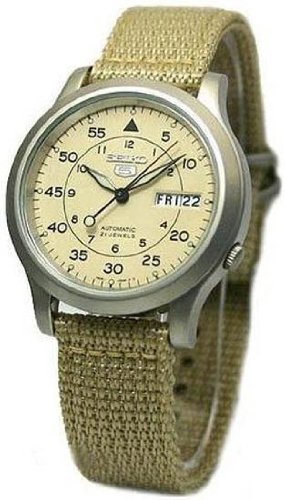 You Save : 53% Seiko SNK803K2 Men's Seiko 5 Automatic Beige Fabric Watch Seiko Authentic SNK803K2 Men's Seiko 5 Automatic Beige Fabric Watch. This fantastic Seiko timepiece includes all high quality features at an affordable price. Gender: Men's Brand: Seiko, Hands: Black and luminous hour and minute hands, black, red and luminous second hand, Model Number: SNK803K2, Markers: Black Arabic numerals and luminous dot hour markers, Case Thickness: 12 mm, Strap Width: 18 mm, Strap Length: 9 inches, Calendar: Date and day display at 3:00, Crown: Push/pull, Water Resistant: 30 meters, Dial Color: Beige, Crystal: Hardlex, Clasp Type: Buckle, Series: Seiko 5, Case: Stainless steel, Movement: Japan automatic, Caliber 7S26B, 21 jewels, Case Diameter: 37 mm, Case Back: Screw-down, exhibition, Strap: Beige weave fabric, Material: Fabric, Size: Men's, Style: Casual